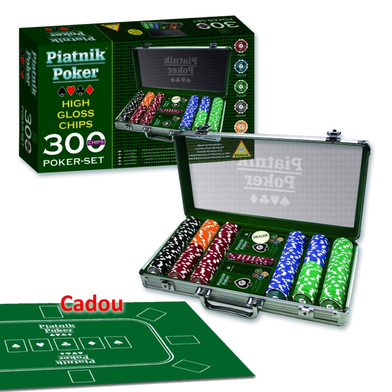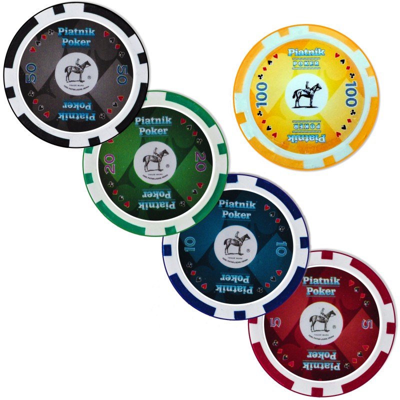 Setul de poker Piatnik include 300 de chips-uri cu greutate de 14 grame, specifica cazinourilor si cluburilor de poker, cu finisaj lucios, placut la atingere, insertie metalica si cu urmatoarele denominari: