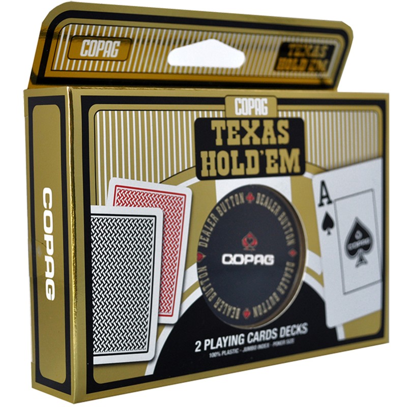 Carti de joc poker, Texas Hold'em, profesionale, 100% plastic, index mare, 2 pachete, rosu si negru, jeton metalic dealer